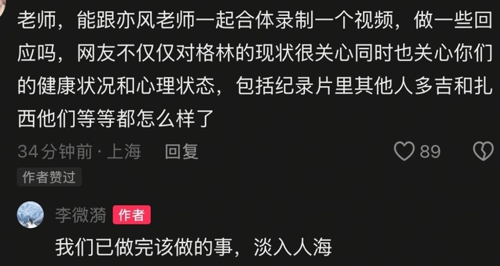 有人表示看纪录片看哭,她回复“要勇敢”,有网友期待她与亦风录制视频回应网友的关心,她回答:“我们已做完该做的事,淡入人海。”李微漪目前正在自驾游途中,她表示网友们可以留言想问的问题,她将整理后再统一回复。