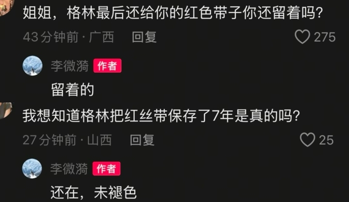 22日晚,李微漪在社交平台与网友暖心互动,回答了不少问题。纪录片中,2013年,李微漪用一条红腰带为格林濒死的幼崽包扎伤口;2020年,李微漪再次回到草原,已进入暮年的格林将这条腰带归还。李微漪表示她还留着格林归还的红腰带:“还在,未褪色。”