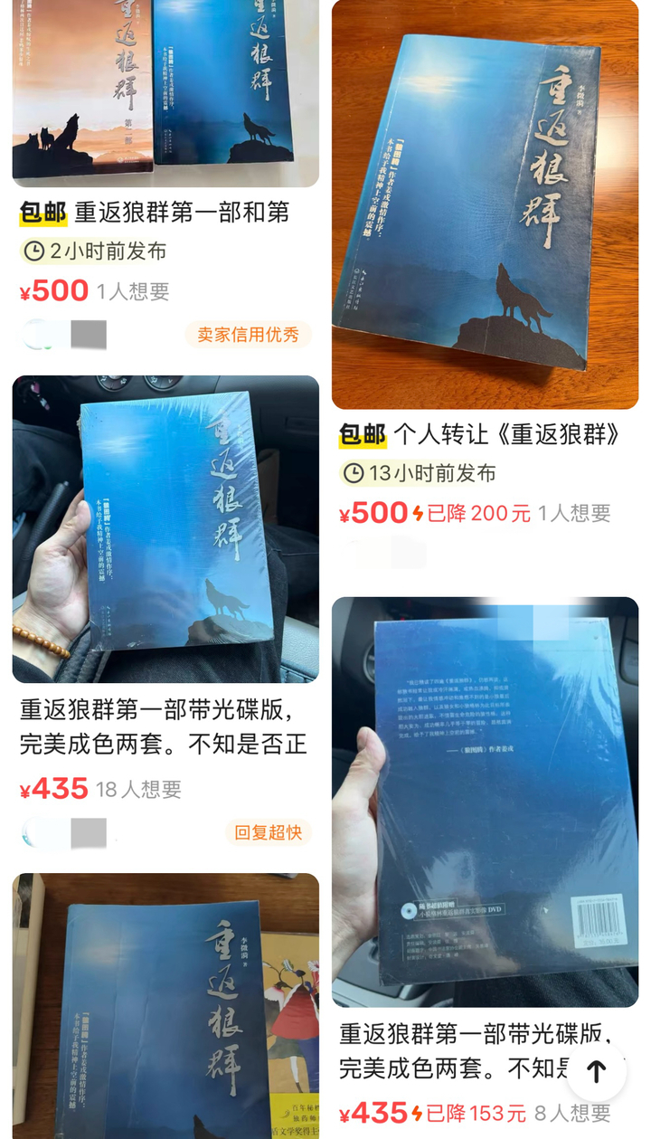 新黄河记者发现,在二手交易平台上,由长江文艺出版社出版的第一版《重返狼群》价格已炒至300元至500元不等。对此,李微漪呼吁网友理性消费,“书籍只是文字的载体,当您翻完最后一页,它的作用也就完成了,大众读物实在不必花高价收藏。大家如果那么想读原著不妨耐心等一等它重新出版。”