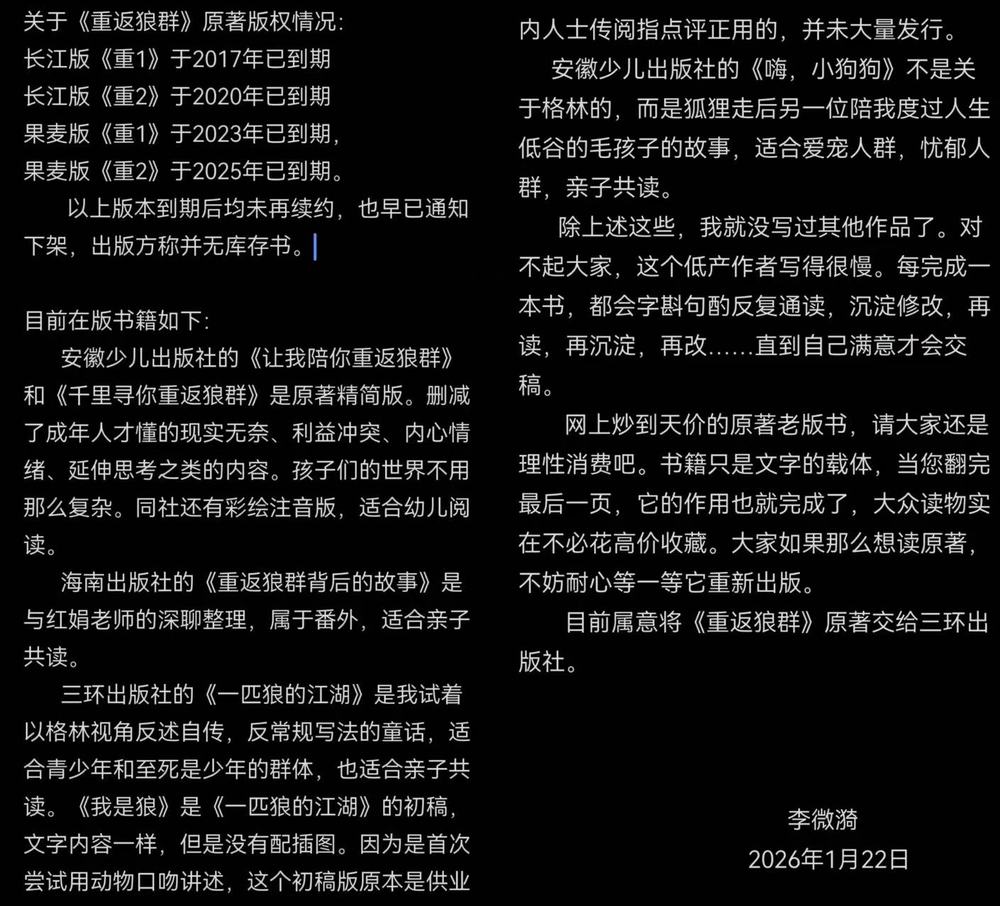1月22日晚,李微漪在社交平台发文回应了图书版权事宜,并在评论区与网友互动。她在文中表示,《重返狼群1-2》原著图书共有两版,分别由长江文艺出版社和果麦文化出版,版权分别于2020年、2025年到期,两个版本到期后均未再续约,出版方称并无库存书。