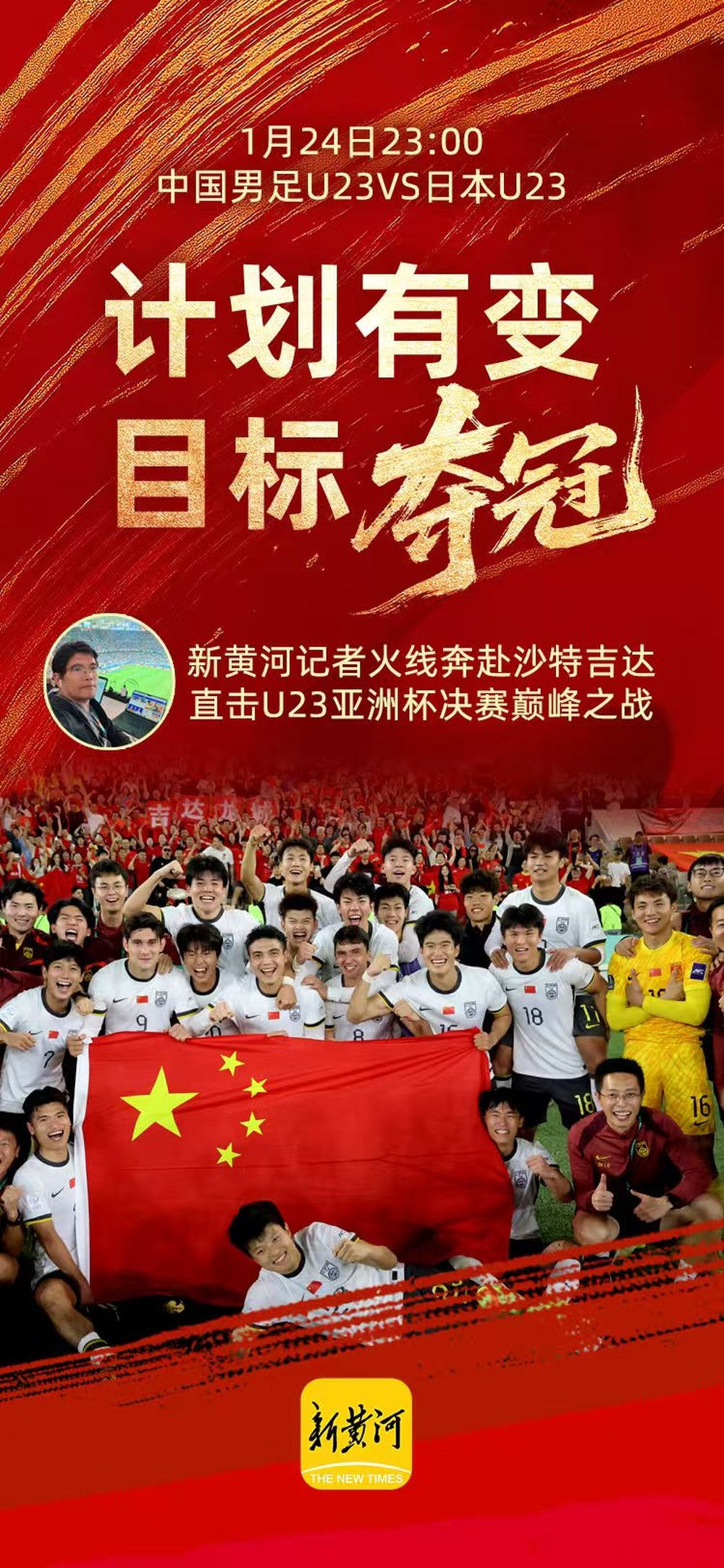 北京时间1月24日比赛开始前,新黄河·济南时报将推出《突破·新生——直击中国男足U23巅峰之战》全景式全媒体滚动报道,前方特派记者与后方报道组携手,在新黄河客户端、微博、抖音、视频号、头条号、百家号、企鹅号、小红书等以及济南时报各大平台号,快速发布第一时间的现场直击、比分快报、焦点热评和深度揭秘。计划有变,目标夺冠!让我们一起见证这一场巅峰对决,期待中国足球新的荣耀诞生。