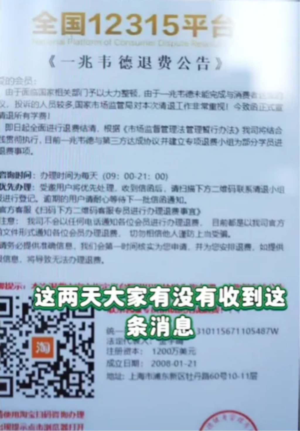 A市民收到顶端标有“全国12315平台”醒目字样的短信图片,标题为《一兆韦德退费公告》,声称清退学费。该市民联系“客服专员”后,被以“购买理财产品退费”“充值返利”“做任务”等名义骗走1.5万余元。