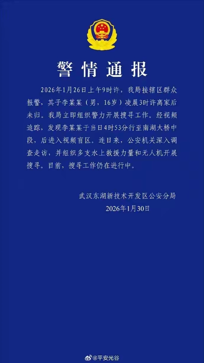 1月30日,武汉市公安局东新分局发布警情通报称,经视频追踪,发现李某某于当日4时53分行至南湖大桥中段,后进入视频盲区。连日来,公安机关深入调查走访,并组织多支水上救援力量和无人机开展搜寻。目前,搜寻工作仍在进行中。