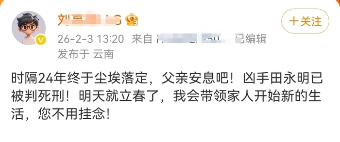 2026年2月3日,随着法槌落下,潜逃近20年、犯下重大罪行的田永明,被云南省高级人民法院以故意杀人罪判处死刑,剥夺政治权利终身,并依法报请最高人民法院核准。这一刻,距离他持刀捅死见义勇为的村民刘铭富,已过去23年;距离他强奸自己的大嫂并首次持刀报复,则已近30年。