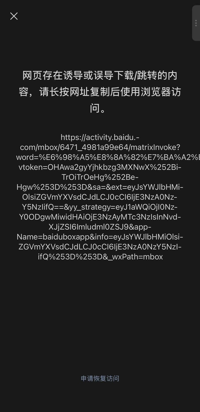 2月4日晚间,新黄河记者实测发现,在微信聊天窗口点击文心助手活动链接时,页面不再跳转至红包主页,而是出现风险提示,称相关网页“包含诱导或误导下载、跳转内容”,并提示用户复制网址后通过浏览器访问。