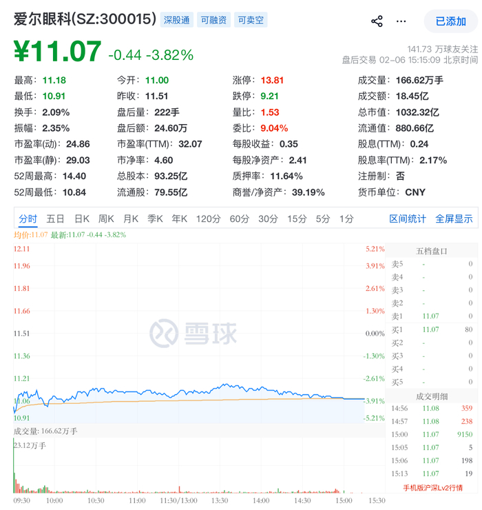 围绕实控人陈邦关联医院涉嫌骗取医保基金的传闻持续发酵,爱尔眼科(300015.SZ)2月6日股价承压明显。