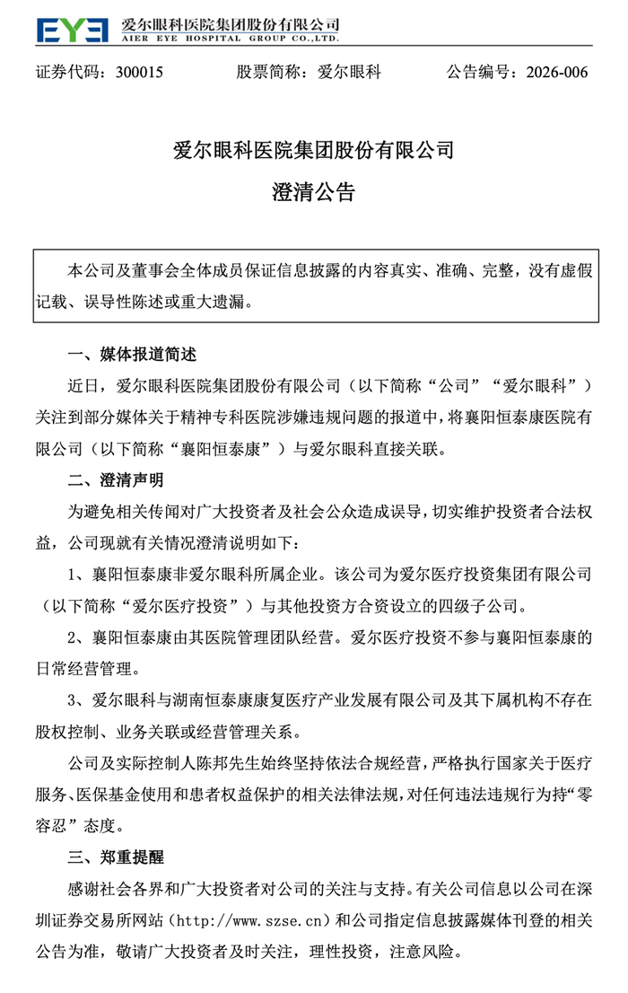 面对舆情升温,爱尔眼科在当日午间披露了一则澄清公告。公司在公告中表示,襄阳恒泰康医院属于爱尔医疗投资集团与其他方合作设立的下属企业,未纳入上市公司体系,上市公司及相关投资平台均未参与其日常经营管理,该医院亦未与上市公司形成股权或业务联系。公告同时提及,公司及实控人对违法违规行为持否定态度。