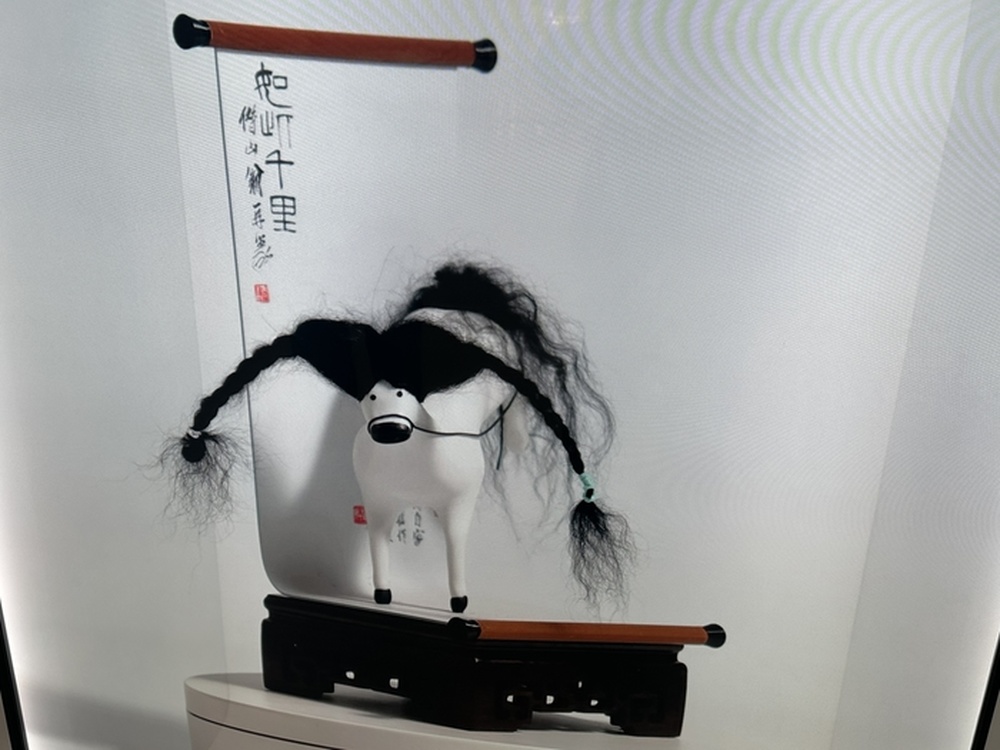 王枝回顾当时的想法,“刚看到齐白石《如此千里》的时候,我们眼前一亮,觉得很有趣味性,但如何表现这匹小马笔墨的简练洒脱以及充满趣味的风格,有点犯难。”经过反复思考,他们决定选取滩羊毛的发排给小马做仿真毛发。