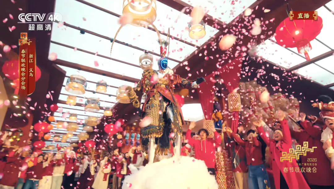 在今晚的中央广播电视总台《2026年春节联欢晚会》上,宇树科技为春晚机器人合作伙伴,旗下人形机器人H2在浙江义乌分会场化身为孙悟空,身披战袍,头戴“雉鸡翎”,外表看起来十分威风。