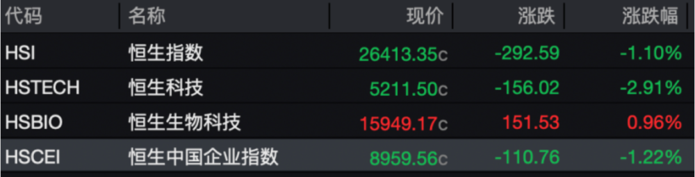 截至2月20日收盘,恒生指数报收于26413.35点,跌幅1.1%;恒生科技指数报收5211.5点,跌幅2.91%;恒生国企指数报收8959.56点,跌幅1.22%。