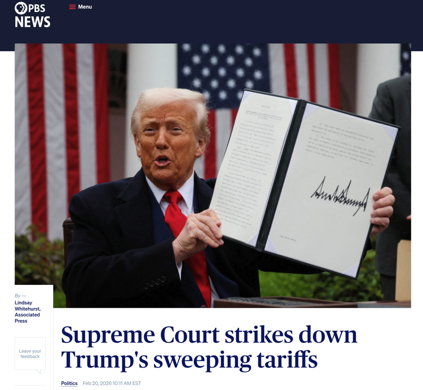 当地时间2月20日,美国最高法院作出“里程碑”式判决:以6比3的多数意见,裁定特朗普政府依靠“国际紧急经济权力法”(IEEPA)征收的一揽子全球关税缺乏法律依据,大部分关税自一开始就“无权征收”,因此无效。