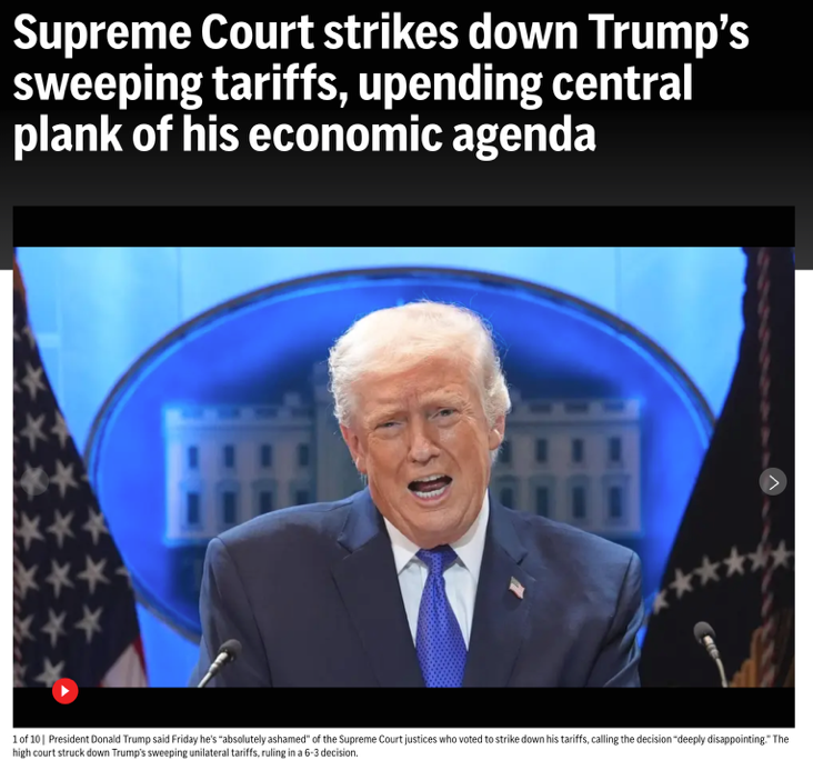 △《时代》报道,最高法院裁定特朗普的大部分关税政策违法,这对其经济议程的核心造成沉重打击