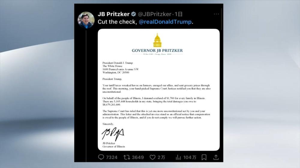 美国伊利诺伊州州长、民主党人普里茨克21日致函美国总统特朗普,要求为该州每个家庭退还1700美元关税,退税总额约87亿美元,约合人民币601亿元。普里茨克在社交媒体发布了相关的账单,并配文“请付款”。