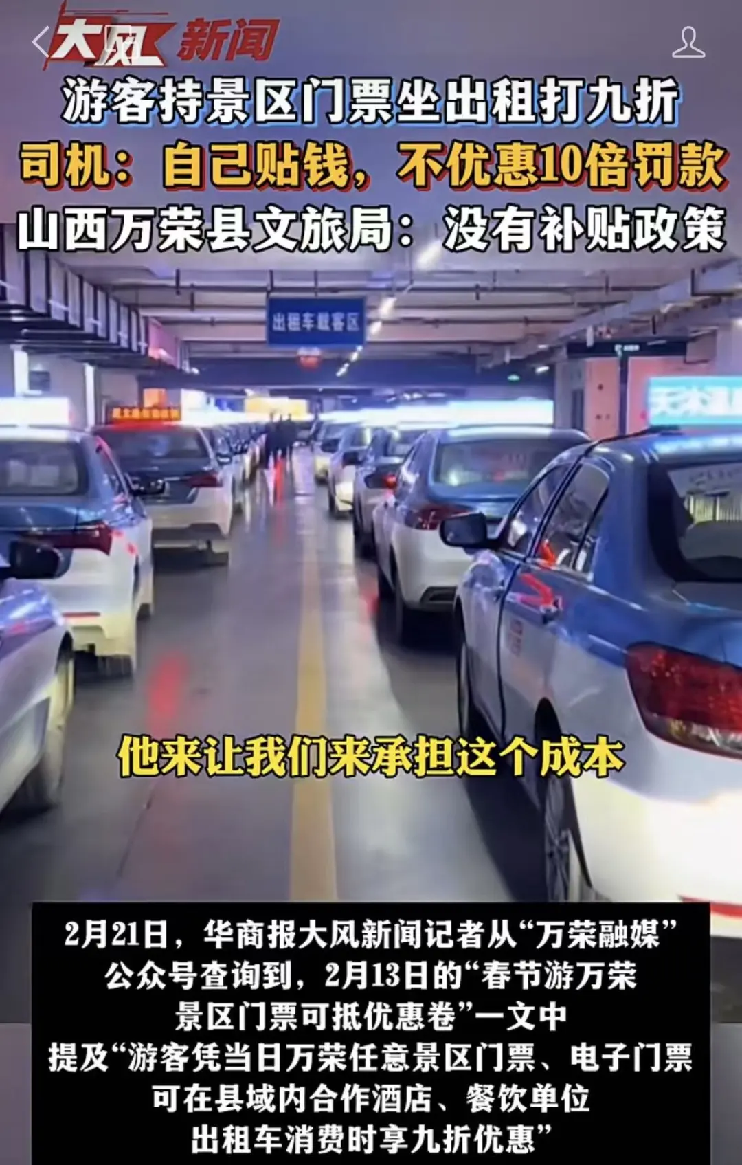 ▲山西万荣县文旅局和工科局联合开展“春节游万荣,景区门票可抵优惠券”活动,引发出租车司机不满。图/万荣融媒