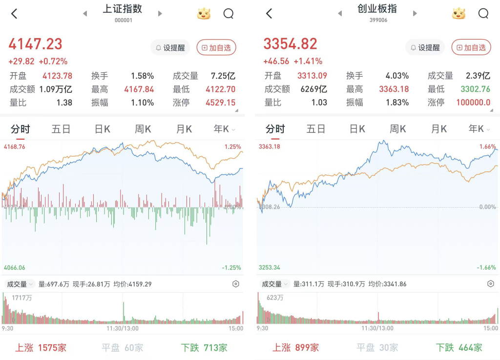 至收盘,上证综指涨0.72%,报4147.23点;科创50指数涨0.54%,报1473.28点;深证成指涨1.29%,报14475.87点;创业板指涨1.41%,报3354.82点。