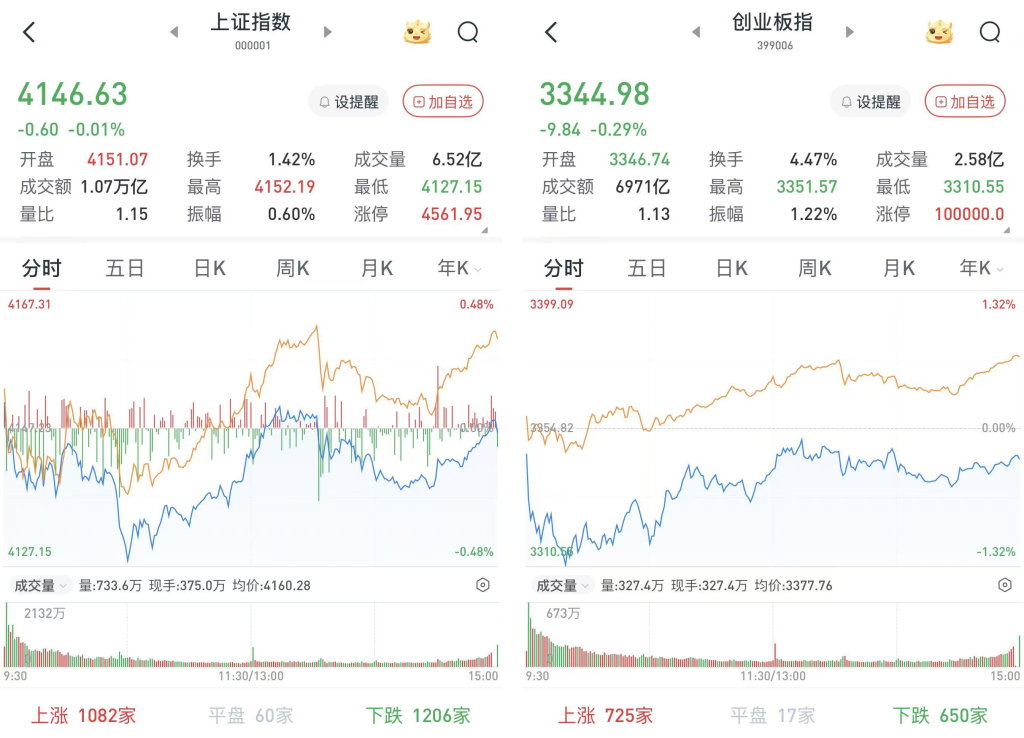 至收盘,上证综指跌0.01%,报4146.63点;科创50指数涨0.85%,报1485.86点;深证成指涨0.19%,报14503.79点;创业板指跌0.29%,报3344.98点。