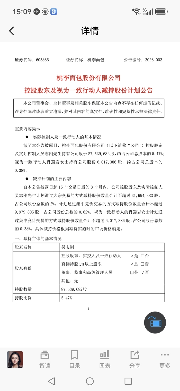 2月25日,桃李面包股份有限公司(603866)发布公告称,公司控股股东、实际控制人吴志刚及其一致行动人肖蜀岩,计划在未来3个月内合计减持公司股份不超过4799.16万股,合计最高减持比例达2.999%,减持原因均为个人资金需求。以2月26日5.32元/股的收盘价计算,若此次顶格减持,吴志刚将套现超2亿元,肖蜀岩则将套现超3000万元。