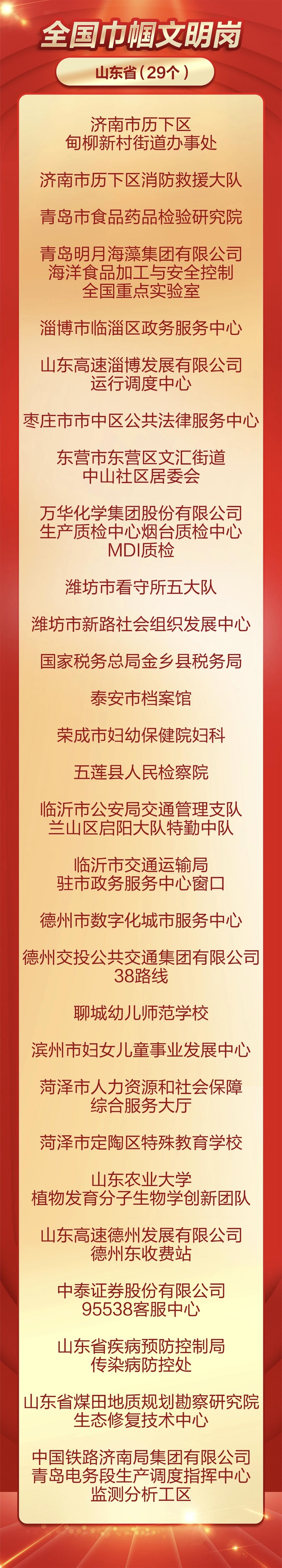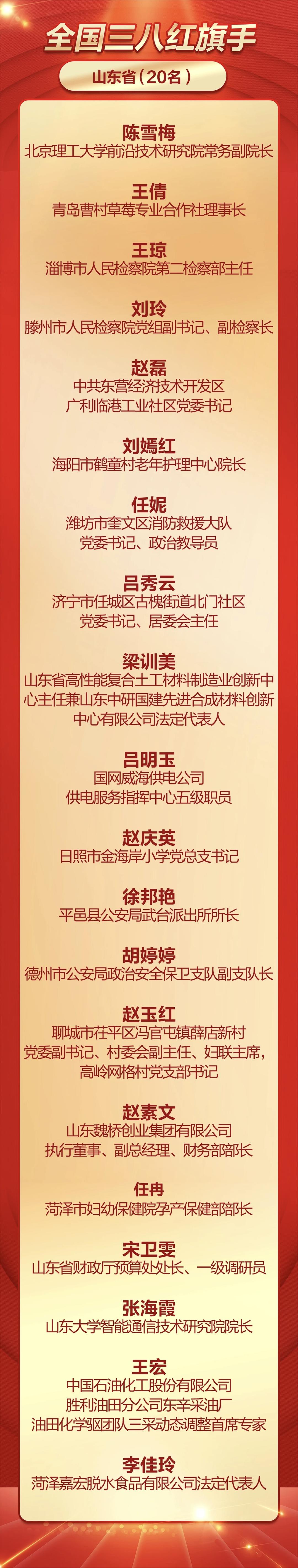 中华全国妇女联合会网站3月2日消息,为表彰先进、树立榜样, 充分发挥先进典型和模范人物示范作用, 全国妇联决定, 授予兰臻等9人全国三八红旗手标兵称号, 授予阮祥燕等598人全国三八红旗手称号, 授予中国人民抗日战争纪念馆社会教育部等400个单位全国三八红旗集体称号, 授予首都医科大学附属北京同仁医院耳鼻咽喉头颈外科等 600 个单位全国巾帼文明岗称号。山东省20名个人、41个单位榜上有名。