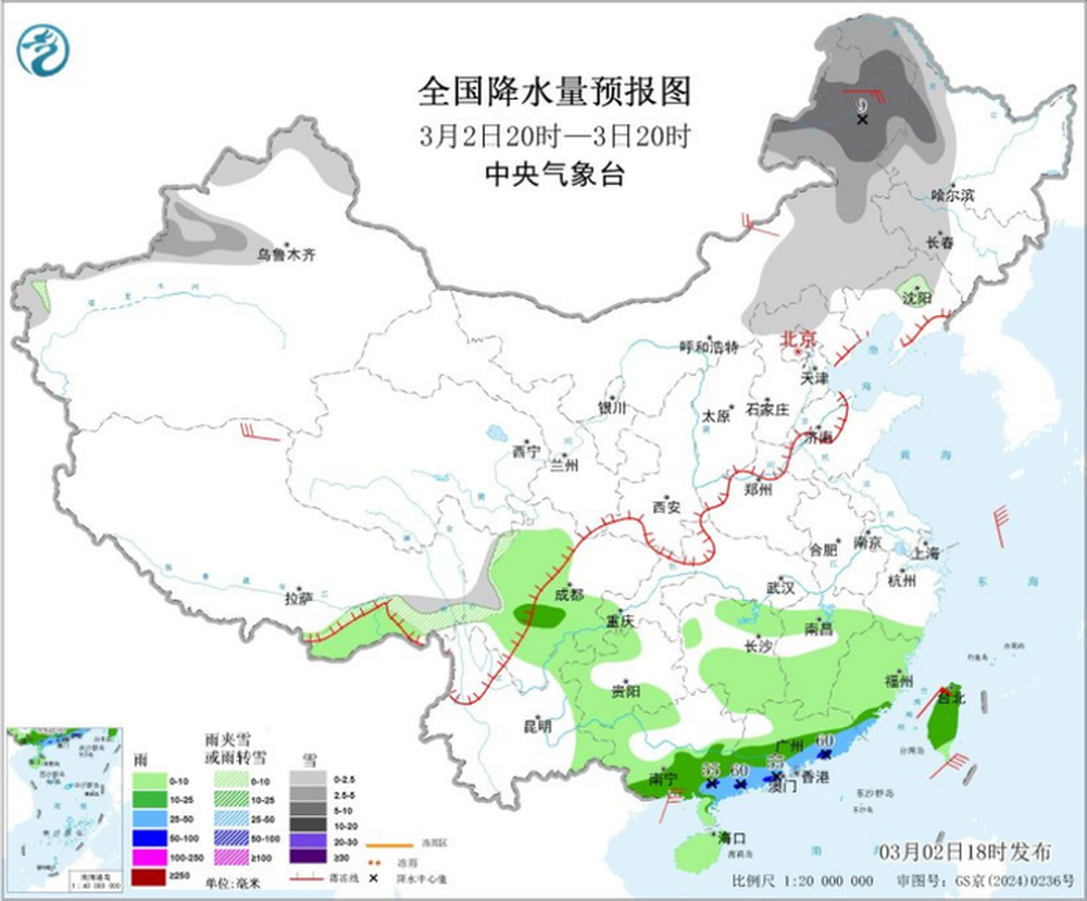 ●2日20时至3日20时,新疆北部、西藏东南部、内蒙古东部、东北地区西部、华北北部等地部分地区有小到中雪或雨夹雪,其中,内蒙古东北部、黑龙江西部等地部分地区有大雪;西藏东南部、川西高原、重庆西部、云南东部、贵州西部、江南中南部、华南南部有小到中雨,其中福建东南部、广东南部、广西东南部等地部分地区有大雨,局地暴雨。