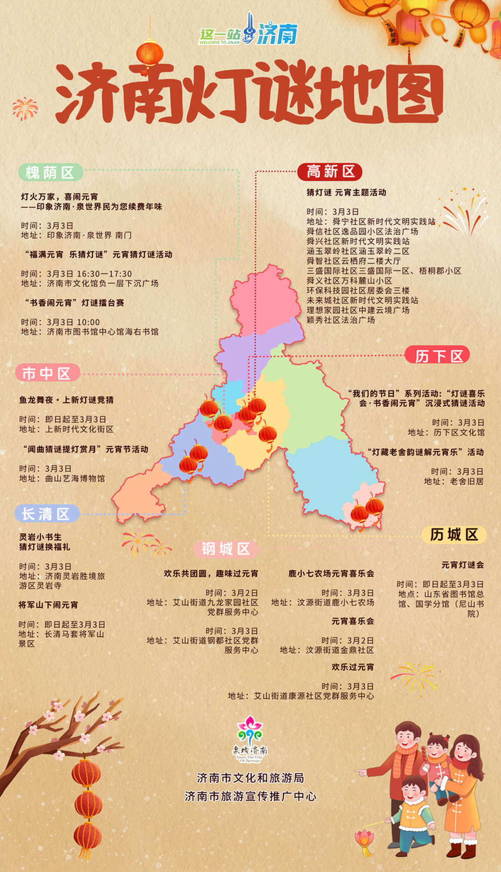 元宵佳节,泉城文旅活动丰富。哪里最热闹?济南市文化和旅游局联合各区县文旅部门倾情推出的这份《济南灯谜地图》请收好。