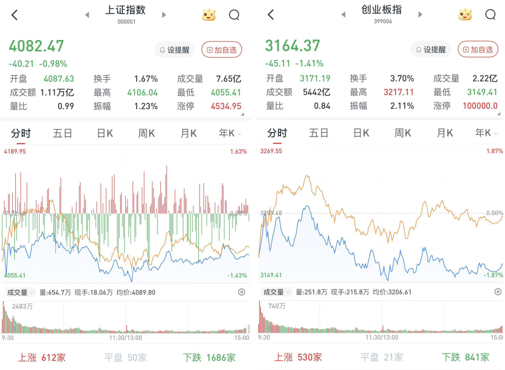 至收盘,上证综指跌0.98%,报4082.47点;科创50指数跌0.49%,报1381.56点;深证成指跌0.75%,报13917.75点;创业板指跌1.41%,报3164.37点。