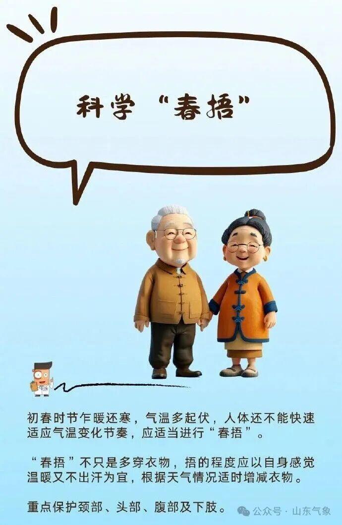 俗话说“春捂秋冻”,初春时节乍暖还寒,气温多起伏,人体还不能快速适应气温变化节奏,应适当进行春捂。捂的程度应以自身感觉温暖又不出汗为宜,即使气温稍高,也可以不着急减衣。一般以昼夜温差大于8℃为信号,温差大就要继续捂,通常坚持到气温稳定在15℃以上,再逐步减衣,但如果捂出汗,则要适当脱掉厚衣服,以防吹风着凉。