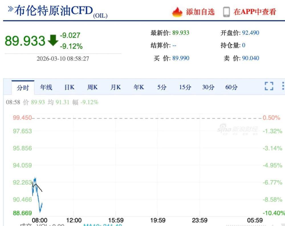 继昨日暴涨逼近120美元/桶后,国际油价迅速回落。3月10日,亚太市场交易时段,布伦特原油和纽约原油双双跌超9%,截至发稿前,分别报每桶89.93美元和85.86美元。详情>>