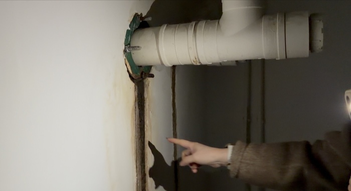 3月5日,记者跟随刘丽丽进入位于联盟新城小区31栋某单元一楼住房后,可见房内有明显装修过的痕迹,部分地面、墙面已铺设好瓷砖。顺着楼梯向地下室走去,刘丽丽指着其中一间房内的白色管道说:“只要下雨,这个管道就会漏水。”记者注意到,白色管道下方的白色墙壁自上而下已形成一道黑褐色的水印,此外四周墙壁亦明显可见霉斑。
