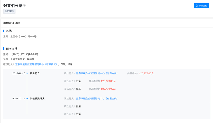 案件流程信息显示,该执行案件【案号:(2025)沪0105执5499号】立案于2025年12月16日,执行标的为226779元。被执行人除方运舟与张勇外,还包括两人共同出资设立的“宜春浪绫企业管理咨询中心(有限合伙)”。