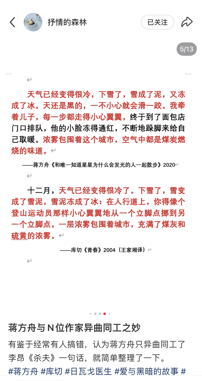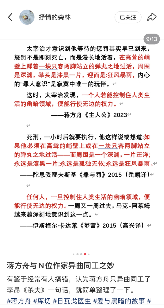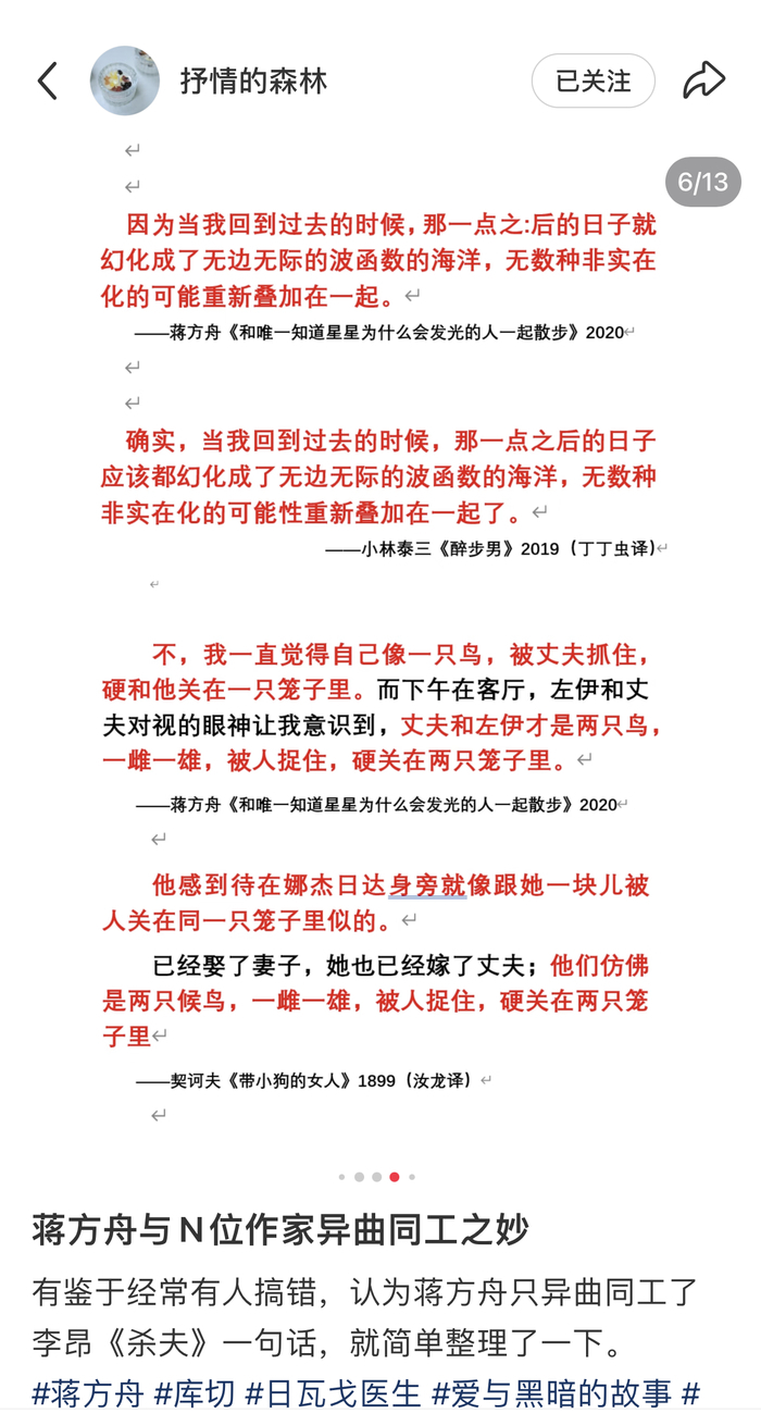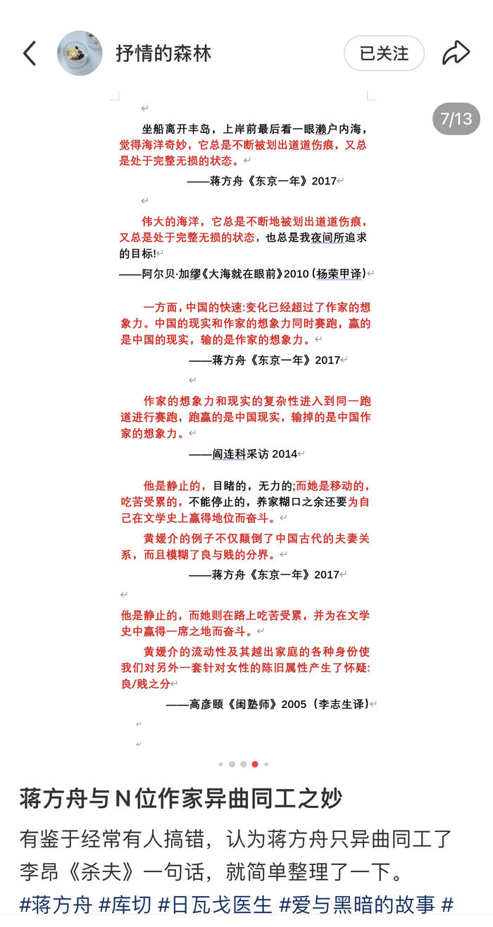 3月13日,“文学鉴抄”博主“抒情的森林”发帖,再指蒋方舟与多位作家“异曲同工”。此前,“抒情的森林”就发帖多次,指出蒋方舟作品中与文学大师的“异曲同工”之处,讨论蒋方舟的真实写作水平。