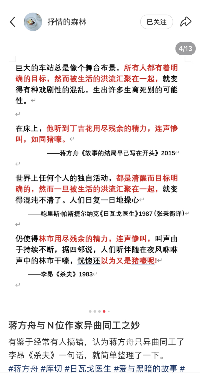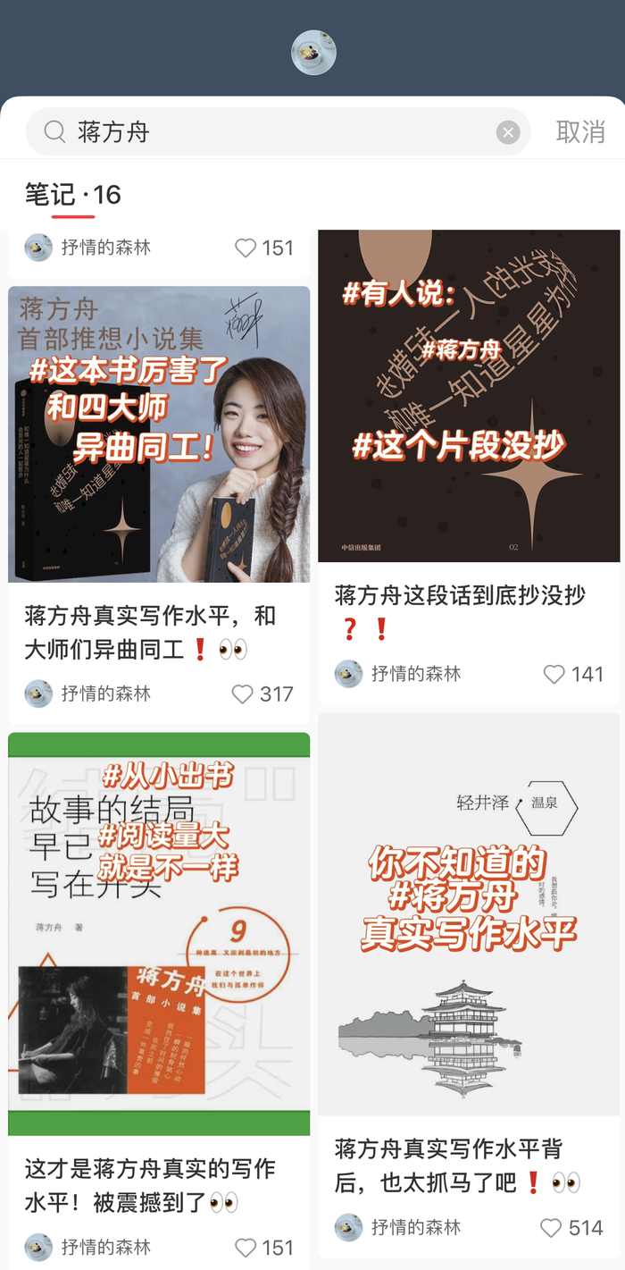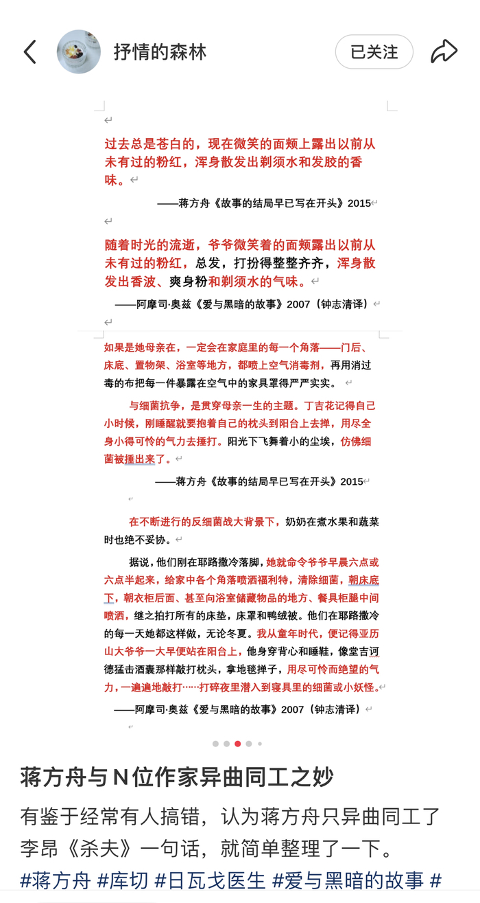 3月13日,“文学鉴抄”博主“抒情的森林”发帖,再指蒋方舟与多位作家“异曲同工”。此前,“抒情的森林”就发帖多次,指出蒋方舟作品中与文学大师的“异曲同工”之处,讨论蒋方舟的真实写作水平。