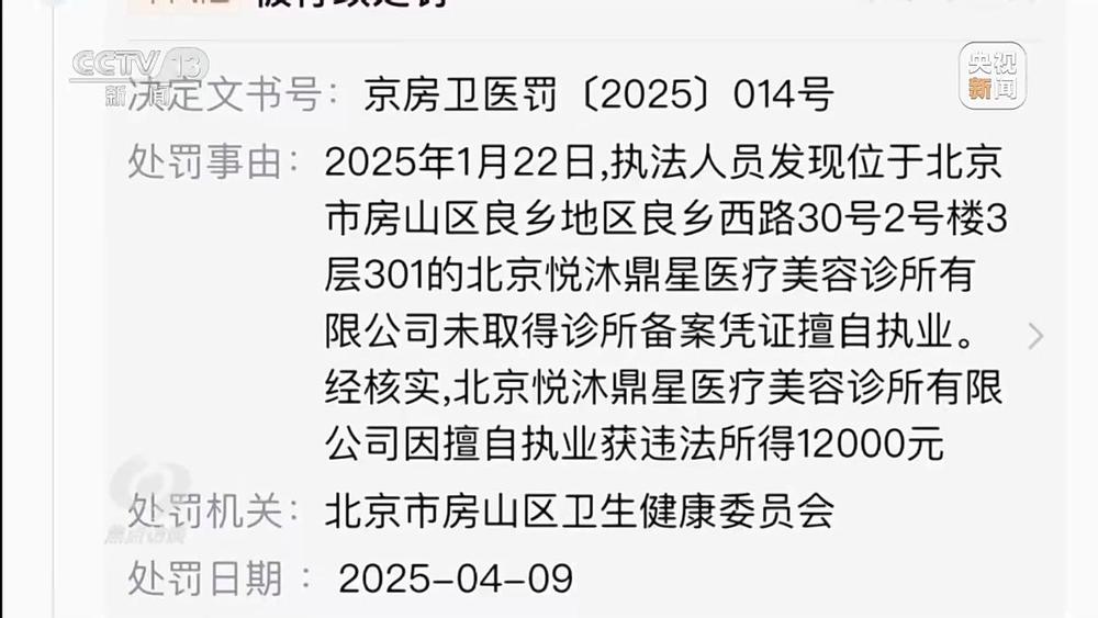 随后,记者了解到,2024年、2025年北京市房山区卫健委先后两次因“未取得医疗机构执业许可证擅自执业”以及“未取得诊所备案凭证擅自执业”对这家公司予以行政处罚。通过查询国家卫健委的相关网站发现,直到2026年1月,这家机构一直没有取得医疗机构许可证以及进行相关备案。调查中记者还发现,这家店的位置是在一个比较偏远街道的二楼上,不容易被发现,那么顾客从何而来呢?实际上,这家医美店一般只接受熟悉人推荐的业务。