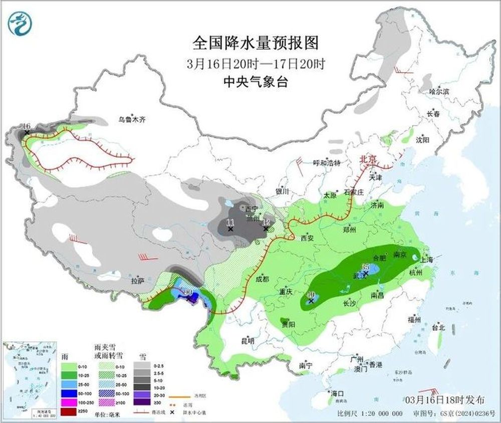 ●中央气象台预计,3月16日20时至17日20时,内蒙古东北部、新疆南疆西部和南部山区、青藏高原大部等地部分地区有小到中雪或雨夹雪,其中,新疆南疆西部山区、西藏东部、青海东部、甘肃南部等地部分地区有大到暴雪。西藏东南部、云南西北部、贵州东北部、湖南北部、重庆东南部、湖北南部和中东部、安徽中南部、江苏南部、江西北部等地部分地区有中到大雨,其中,西藏东南部局地有暴雨。