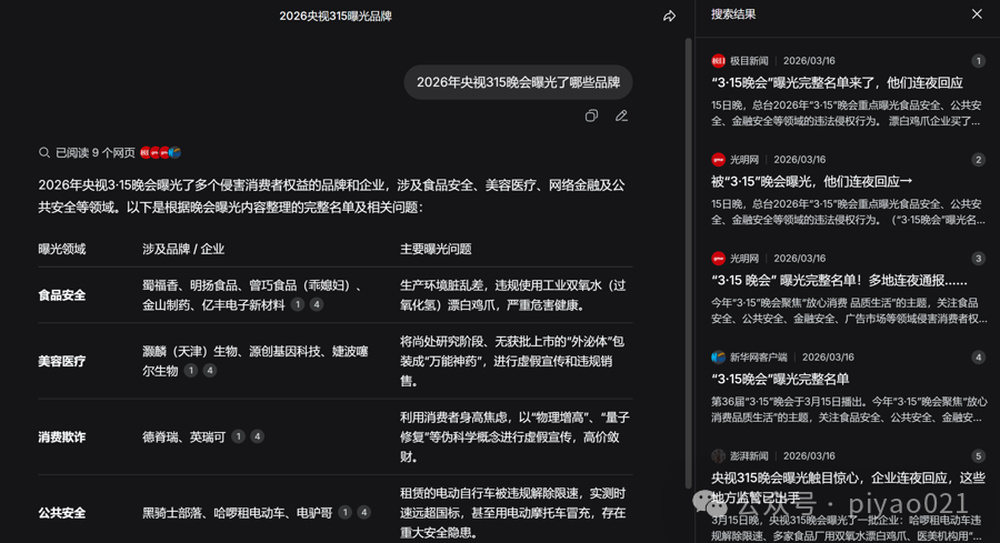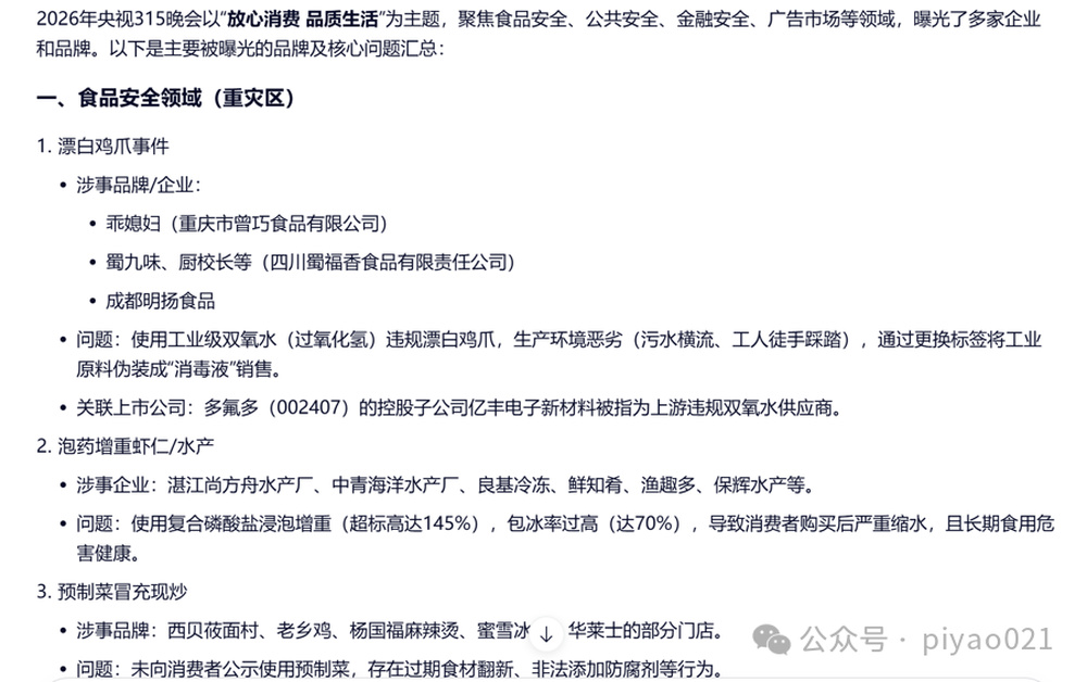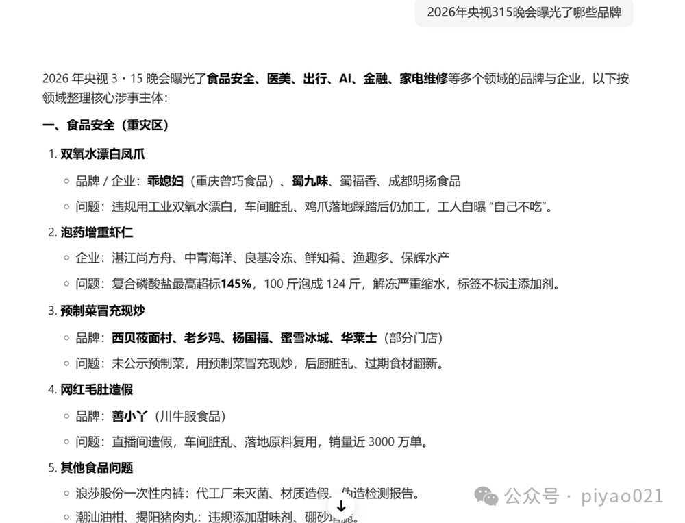 该大模型提供的第二个链接是某自媒体围绕今年央视“3·15”晚会的“解读稿”,账号权威性值得商榷。至于内容,更是差错百出,其中最明显的是“解读稿”称,2026年“3·15”晚会曝光的第一个案例就是“泡药虾仁”——由此也能解释为什么大模型将它作为参考链接。记者又用检测工具检测了这篇“解读稿”的“AI含量”,它被判定为“人工创作特征较弱”。换句话说,这篇文章很可能由大模型生成,所以它所涉及的案例也出现了偏差。