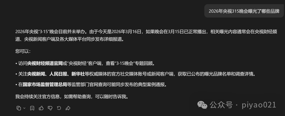 3月16日,记者对消费者最常使用的4个AI大模型做了一个简单测试:向它们提出同一个问题“2026年央视3·15晚会曝光了哪些品牌”。结果,只有一个大模型回答正确。其余3个大模型中,有两个的答案中不仅有今年案例,还包括往年案例;剩下一个最离谱,竟然回答“2026年央视3·15晚会目前并未举办。由于今天是2026年3月16日,如果晚会在3月15日已正常播出,相关曝光内容通常会在央视财经频道、央视新闻客户端及各大媒体平台同步发布详细报道。”