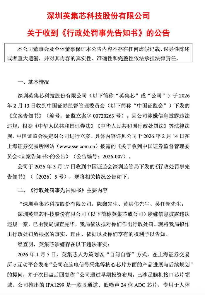 3月17日晚,科创板公司英集芯披露收到行政处罚事先告知书。围绕此前“脑机接口”相关表述,监管部门认定其存在误导性陈述行为,拟合计处以800万元罚款,并对多名核心高管同步追责。