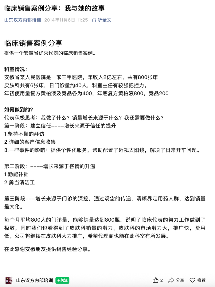 而在另一篇2014年发布的《临床销售案例分享》中,生动描绘了如何在一个月门诊量800人的皮肤科,将复方黄柏液的销量做到800瓶的“极致”业绩。其传授的“客情升温”秘诀,包括为科室主任“提供个性化服务,帮助配置近视太阳镜”等。