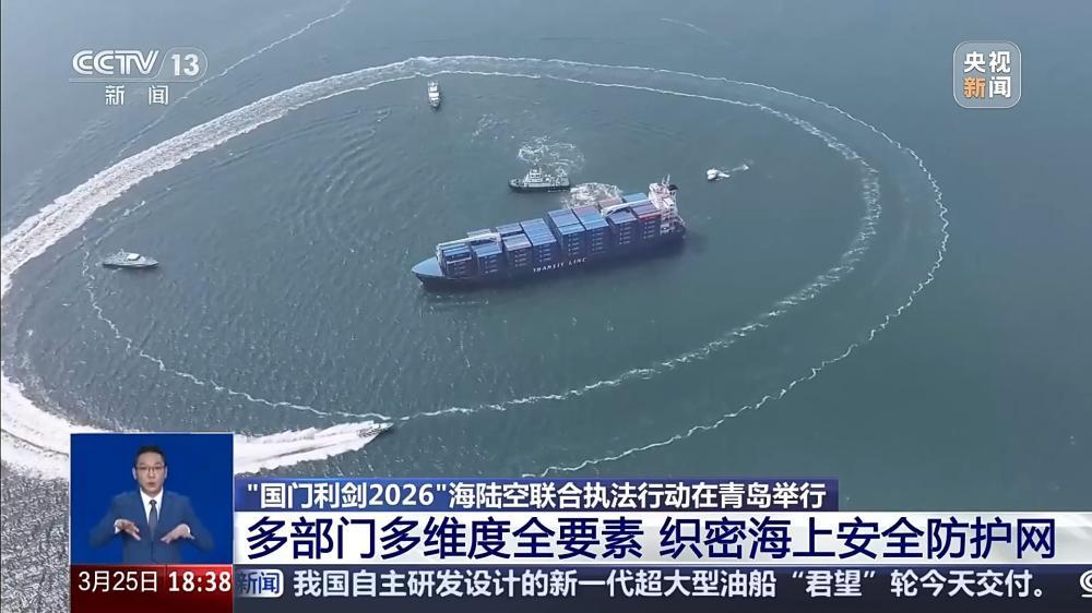 25日,山东黄岛边检站、海关、海警等涉海部门在青岛海域开展“国门利剑2026”海陆空联合执法行动。