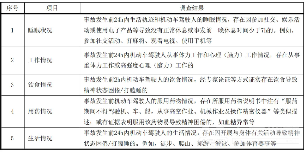 交警对机动车驾驶人驾驶车辆出发前睡眠状况和工作、饮食、用药、生活等情况进行调查,证实存在下表中列举的一项或多项调查结果的。