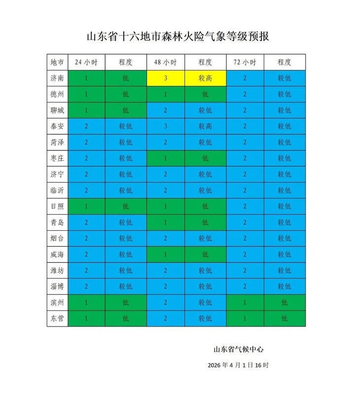 从全省预报情况来看,4月1日山东各地火险等级整体偏高。其中,济南、淄博、枣庄、东营、潍坊等12市森林火险等级为三级(黄色预警),青岛、烟台、威海、日照4市升至四级(橙色预警),火险等级高,林区需严格落实火源管控措施,严防森林火灾发生。