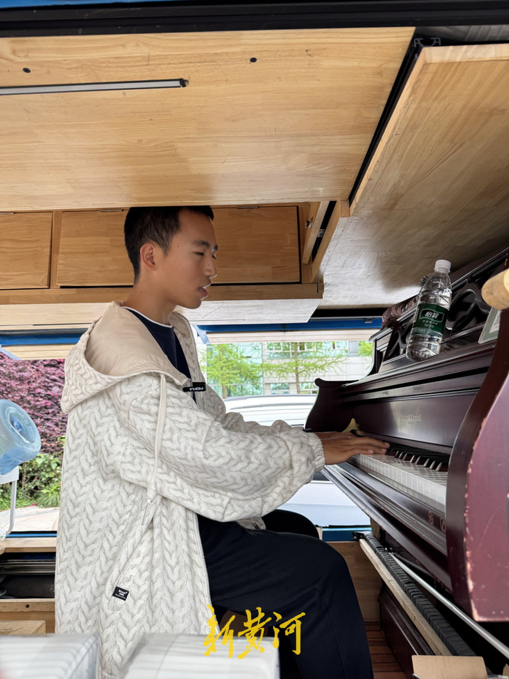 2024年7月,轩轩从特教学校毕业。干强送给儿子一份特殊的礼物——一辆由二手面包车改造而成的咖啡车。车内一角特意放了一架钢琴,那是轩轩的音乐角落,也是这辆蓝色小车最温柔的标志。