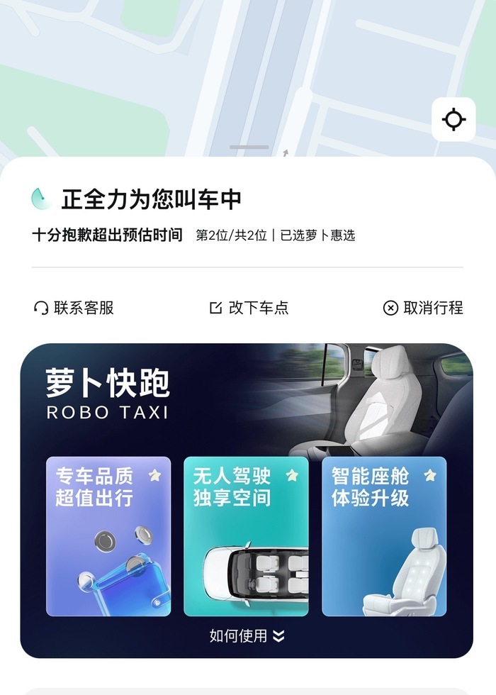 4月1日,新黄河大鱼财经记者在武汉实地下单预约“萝卜快跑”,小程序上显示,当前用户在排队中,但实际等候超过20分钟仍未派单,官方客服回应说,“武汉全区域已暂停服务,当前运力紧张,暂时没有可以接待的车辆。请更换其他出行方式。”