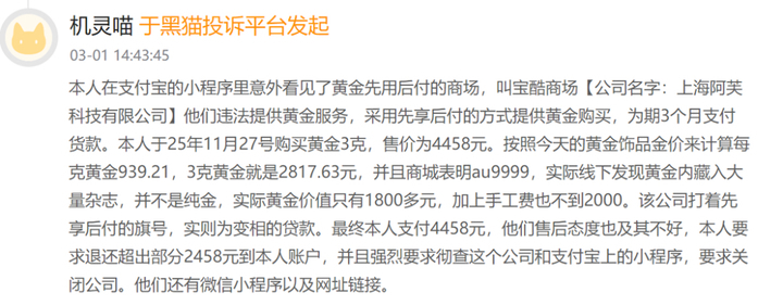另一名消费者于3月1日投诉称,在宝酷商城购买了3g黄金,售价4458元,商城标明Au9999,但该用户表示,实际线下发现黄金内藏大量杂质,并非纯金,实际黄金价值只有1800多元,加上手工费也不到2000元。