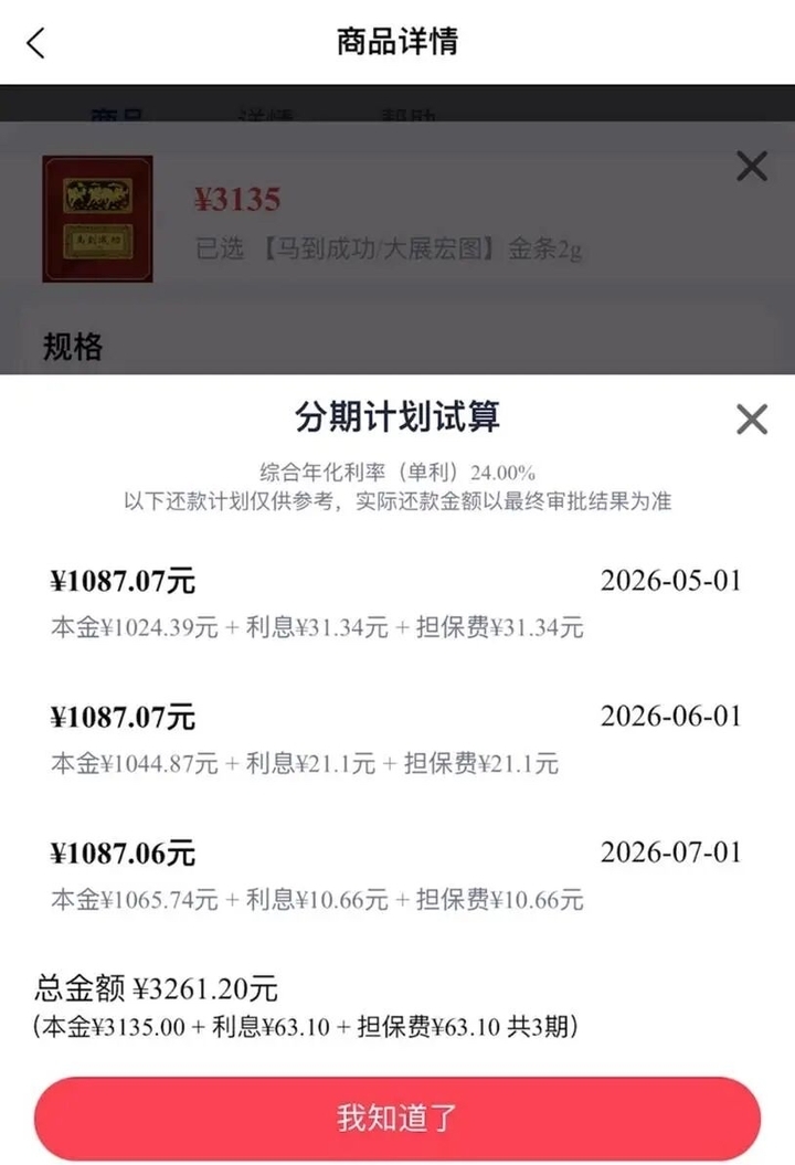 点击立即购买,该平台给出分期支付和全额支付两种结算方式,分期支付给出的试算计划显示,这款标价3135元的2g金条,需要在3个月内还款3261.2元,每期约支付1087元。