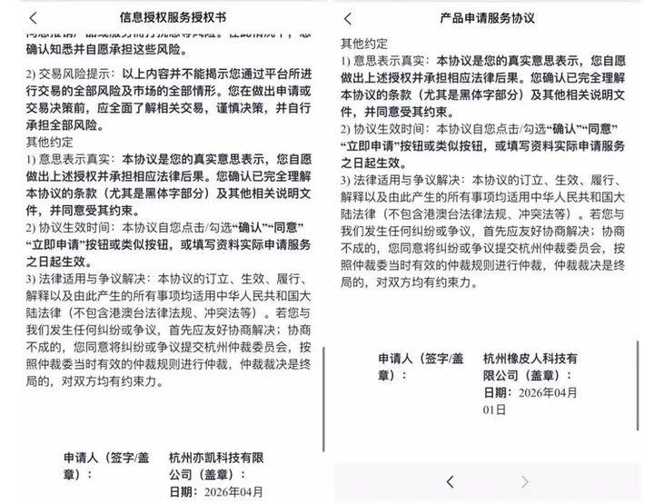 此外,用户还需与杭州亦凯科技有限公司(本文称“亦凯科技”)、杭州橡皮人科技有限公司(本文称“橡皮人科技”)分别签订产品申请服务协议(含信息授权)。