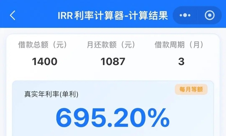 若记者完成下单—回收套现这一流程,按照到手1400元,后续在三个月每期支付1087元来计算,该笔借贷用户实际承担的综合融资成本折算成年化利率高达695.2%。