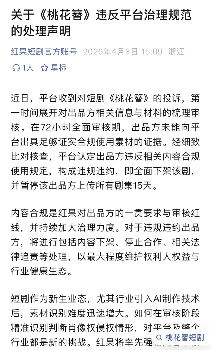 声明显示,平台收到投诉后第一时间展开对出品方相关信息与材料的梳理审核。在72小时全面审核期内,出品方未能向平台出具足够证实合规使用素材的证据。经细致比对核查,平台认定出品方违反相关内容合规使用规定,构成违规违约,已全面下架《桃花簪》,并暂停该出品方上传所有剧集15天。