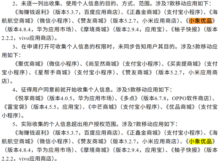 4月2日,国家网络安全通报中心通报了37款移动应用存在违法违规收集使用个人信息情况。其中小象优品等商城类应用被点名。通报显示,小象优品涉及的问题包括未逐一列出收集、使用个人信息的目的、方式、范围;实际收集的个人信息超出用户授权范围。