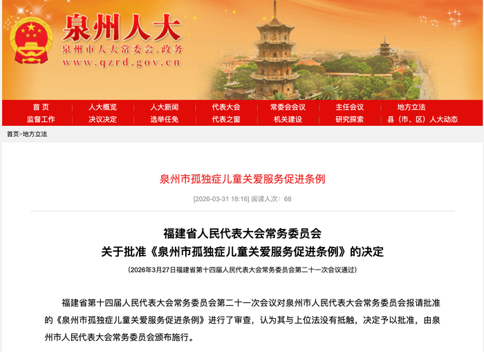 为何有这样一部立法,泉州市人民代表大会常务委员会副主任张翼翔在关于《泉州市孤独症儿童关爱服务促进条例》的说明中提到,制定孤独症儿童关爱服务促进条例,是泉州的成熟经验总结固化,对发挥泉州作为“全国孤独症儿童关爱促进行动先行先试地区”的示范带动作用具有重要意义。值得注意的是,该《条例》通过依据《中华人民共和国未成年人保护法》,明确任何单位或者个人侵害孤独症儿童合法权益的,应当依法承担法律责任。也明确了有关单位及其工作人员违反本条例规定,在孤独症儿童关爱服务工作中滥用职权、玩忽职守、徇私舞弊的,由有权机关对直接负责的主管人员和其他直接责任人员依法给予处分;构成犯罪的,依法追究刑事责任。