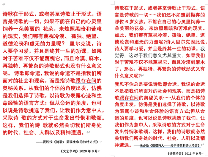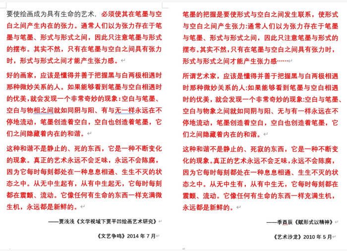 据“抒情的森林”所发帖文,贾浅浅的另一篇学术论文《文学视域下贾平凹绘画艺术研究》中,有多处、相当篇幅的内容来自他处。其中,关于中国传统的画论的一段描述,来自朱良志的书作《中国艺术的生命精神》;关于笔墨张力的描述,则是来自季酉辰的文章《赋形式以精神》;关于贾平凹绘画气韵和审美的描述,来自曾令存的《禅宗意识与贾平凹的散文创作》;关于中国绘画三个阶段的描述,来自韩羽曾刊发于《美文》的文章《自己与自己斗,其乐无穷——答友人问》。